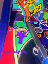 The remainder of the installation of the protector is as follows- The tab on the lower front edge is held in place by simply being pinched between the scoop weldment and the bottom side of the playfield. Therefore, the weldment must be loosened enough to slip the tab in between then retightened. The upper tab with the punched hole is held in place by the post behind the scoop hole. This must of course be removed and then inserted through the protector tab and tightened again from the bottom side. Total time to install is about 30 minutes.